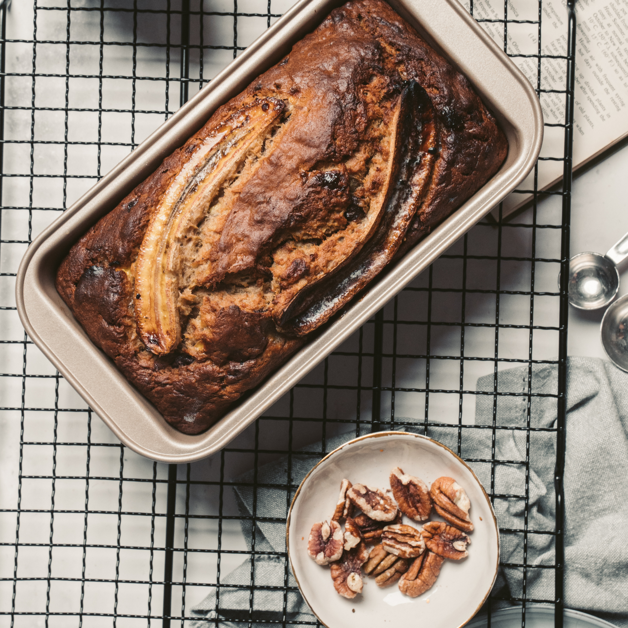 Fresh banana bread coming out of the oven.